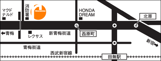 進行方向の最初の信号「田無5丁目」を右。新青梅街道に出て「西原町」交差点を左。進行方向右にあり。