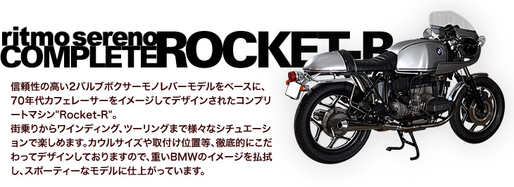 信頼性の高い2バルブボクサーモノレバーモデルをベースに、70年代カフェレーサーをイメージしてデザインされたコンプリートマシン”Rocket-R”。