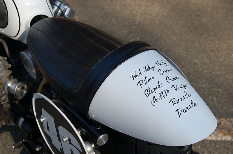 シートはAMP design製。AMPとは、なんだかんだ、かれこれ10年以上の付き合い。こだわりの造形師です。60年代ベイツのシートのレプリカを、さらにこの車両に合うよう前半は作り直して製作。表皮はRazzle Dazzleにて。両者のおかげにより、タンク&シートの造形バランスはかなり良く出来たと思います。