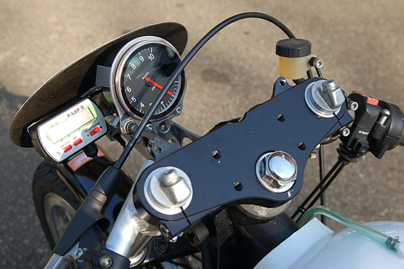 ゼッケンとメーターはフレームマウントに。ガソリンキャッチタンク、タイム計測用P-Lapもそこへ一緒にマウント。