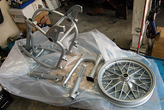 車両を全バラにしてフレームから粉体塗装を行なうフルレストアも得意科目。納期の余裕を見ていただければじっくり作業いたします。
