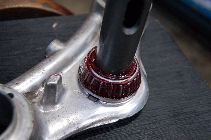ここはテーパーローラーベアリングなので、イニシャルを規定値かけてロックナットを締め込みますが、イニシャルのかけ具合によってはスイングしないスイングアームになってしまいます。