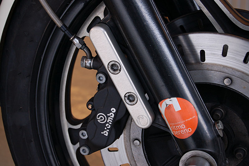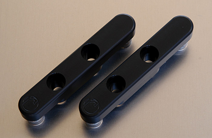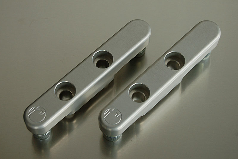 BMWの純正2podキャリパー(おむすび)をブレンボ4pod(40mmピッチ)に変更するキャリパー サポートです。NCマシニングによる高精度な削り出しです。 アウターチューブに固定するボルト穴は表からは見えないようデザイン しているので、見た目もスッキリです。