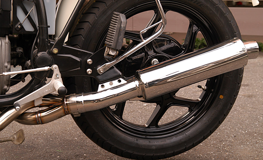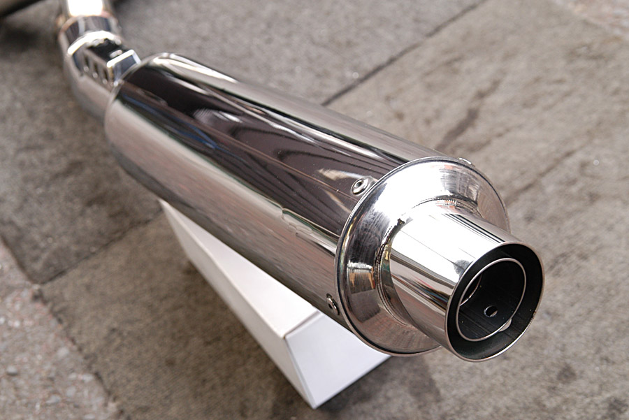 当店オリジナルのステンレス2in1フルエキゾーストです。「完全ボルトオン」「センタースタンド使用可能」「パニアケース使用可能」「タンデムステップ使用可能」で、純正の使い勝手をスポイルしない設計となっています。ノーマルエンジンでも好レスポンス&高回転の吹けを実現し、さらにキャブ交換やチューンにも対応。レース参戦でのデータを生かした設計で、本格的なエンジンチューニング、サーキット走行に対応できるマフラーです。 エキパイは肉薄ステンを使用しており、かなりの軽量化も実現、サイレンサーは外板には肉厚ステンレスを使用し高耐久と心地よい低音を実現、インナーパンチングはストレートタイプとなります。